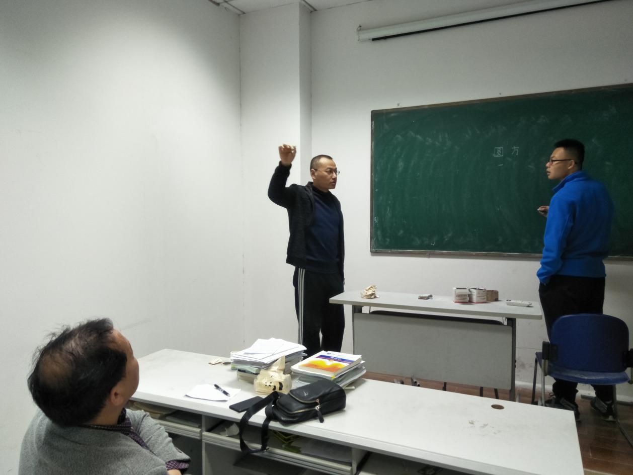 马老师首先向同学们介绍了粉笔字三指执笔的基本方法并亲自板书示范。他指出,在前的食指应距离粉笔头1.5公分左右,不能太远或太近;笔杆应指向掌心,不能太上,也不能指向虎口;每个字的大小应在8-10公分;单个字的书写讲究结构匀称、重心平稳,不要刻意追求横平竖直,竖写的字要立得起来,应倾斜5-7度,而不是贴在黑板上。