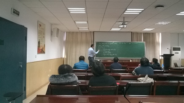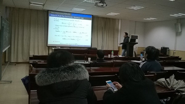 王作勤教授的报告从最简单的数论中的格点计数问题讲起,深入浅出,慢慢谈到它与流形上特征值计数之间的深刻联系。让我们看到了2个不同领域几何和数论之间的深刻联系。李逸研究员的报告展现了一些完全非线性偏微分方程的结果,并介绍了它们在复几何中的应用。 报告后,两位专家就研究内容与在座的老师同学们展开了深入的交流。 专家简介: 王作勤,中国科学技术大学数学公司教授。2008年于美国麻省理工公司获得博士学位,之后先后在美国霍普金斯大学以及密西根大学工作。回到中国科学技术大学担任教授、博导。主要研究兴趣为谱几何、辛几何、半经典微局部分析。主要研究结果发表在《J. Differential Geometry》、《J. Functional Analysis》等国内外学术刊物上。 李逸,上海交通大学数学科学公司特别研究员。2012年于哈佛大学获得理学博士学位,2012.06至2013.5,约翰霍普金斯大学数学系讲师。近年来主持国家自然科学基金1项,上海市科研项目1项。在《Cal. Var. PDE》,《JDE》,《Pacific J. Math.》,《Analysis & PDE》,《Asian J. Math》,《Math. Res. Lett.》,《Sci. China Math.》等国内外学术刊物上发表论文14余篇,其中被SCI收录14篇。目前主要研究兴趣为几何流、复几何及广义相对论。 |