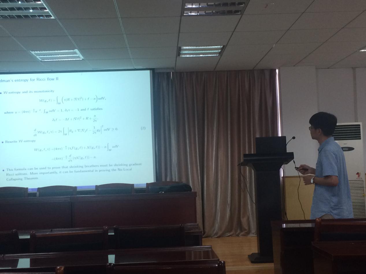 王宇钊博士介绍了近几年同合作者关于黎曼流形上几类扩散方程熵公式的系列结果,同时也给出了可以继续思考的几个问题。在报告结束后与师生展开了讨论,解答了师生提出的很多问题。