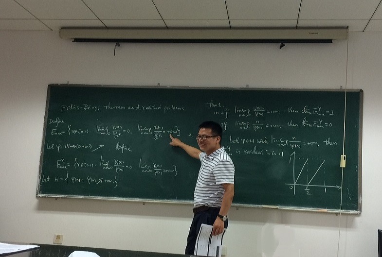 李进军从Erodos-Renyi极限定理的原始形式开始,循序渐进地展开,讲述了二种情形下Erodos-Renyi极限定理中的例外集的分形维数公式,并探讨了它们的相关动力系统的结论。报告后提出了可以进一步考虑的问题,大家展开了热烈讨论。