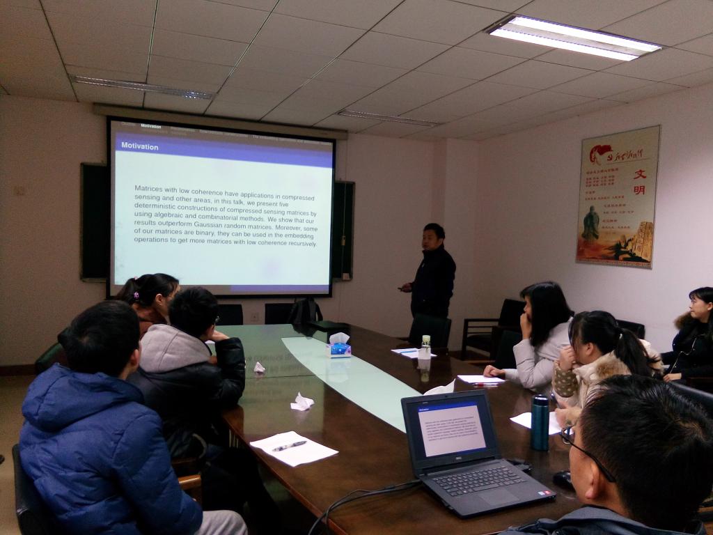 12月26日上午,南京航空航天大学曹喜望教授应邀来访公司,并在院203作了一场题为《Five deterministic constructions of compressed sensing matrices with low coherence》的学术报告。