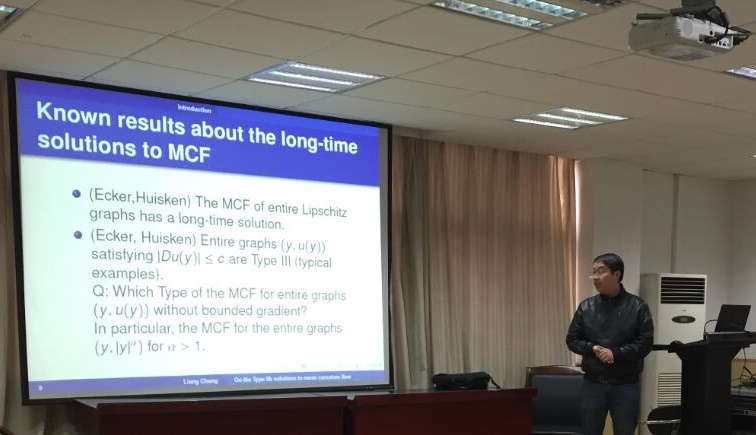 12月28日下午,华中师范大学的程亮老师应邀来公司访问,并在院201报告厅为师生作了题为“On the Type IIb solution to mean curvature flow “的专题学术报告。