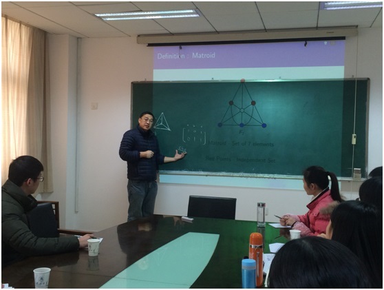 在报告中,吴海东教授首先介绍了拟阵的基本知识、经典的研究成果与研究现状,以及本人在相关方面所做的工作,并给我们介绍了一种常用的软件工具。报告结束后,吴海东教授还关于研究生如何有效的学习及科学研究等问题与大家分享了自己的感想。