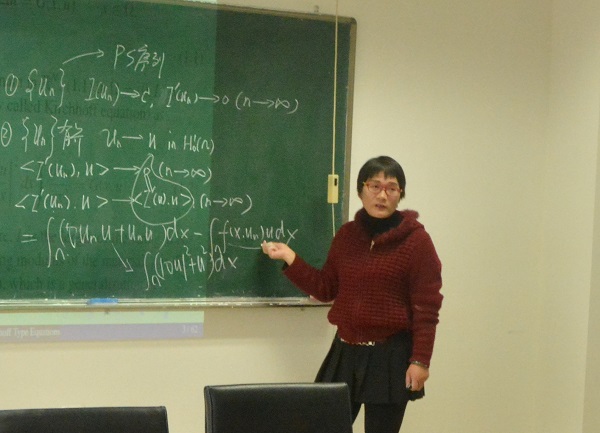 丁凌教授的报告深入浅出,从变分方法入手,主要介绍了她在Kirchhoff type equation方面的最新研究成果。报告后,丁老师就研究内容和研究生基础课程的学习与在座的老师同学们展开了深入的交流。