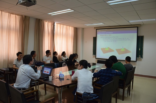 郭玉劲研究员在报告中首先从物理实验和数学描述的角度分别介绍玻色-爱因斯坦凝聚态(BEC)现象,然后重点从数学分析的角度探讨吸引力作用下BEC中的临界变分问题,包括泛函约束极小的存在性、渐近性等。报告结束后,在座的师生与郭研究员就相关问题进行了积极的提问与交流,大家对这一研究方向有了更深入的了解,同时也开阔了广大师生的视野。