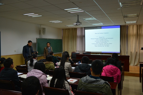 曹喜望教授的报告将两个著名猜想Fredman猜想和Wiedemann猜想联系起来,证明了当所考虑的正整数N为费马数时, 若Wiedemann猜想成立,则Fredman猜想也成立,并给出正整数N为某些特殊形式时,Fredman猜想中结论成立。长达一个小时的精彩报告获得了在场师生的一致好评。