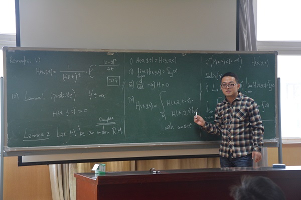 毛井结合自己的学术研究,向师生们介绍了径向曲率有界的完备黎曼流形,给出一个热核比较定理。此外,还介绍了该热核比较定理的一个有趣的应用。报告结束后,毛井还与到场的研究生进行了热烈的交流,现场气氛非常活跃。