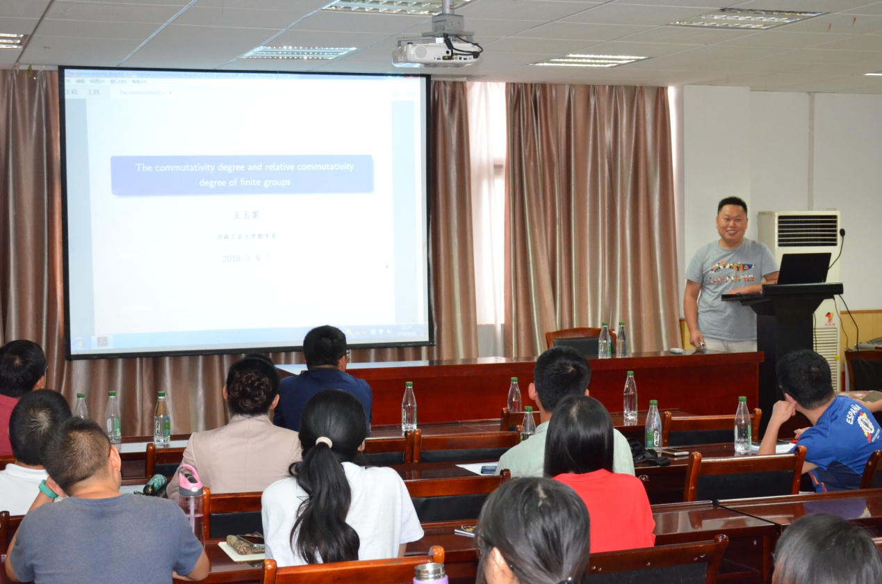 河南工业大学王玉雷副教授做了题为“有限群的交换度和相对交换度”的报告。王教授首先介绍了交换度的相关概念,然后讨论了有循环Frattini子群的有限p-群的交换度,接下来给出相对交换度的相关概念,及有限群的自交换度和相对自交换度的一些例子,最后介绍了广义超特殊p-群相对自交换性的几个定理。