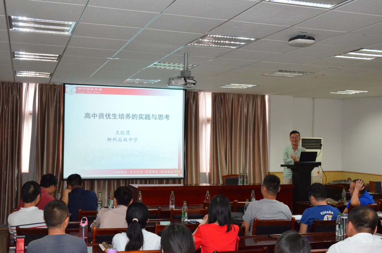 柳州高级中学吴佐慧老师做了题为“高中(数学)资优生培养的实践与思考”的报告。吴老师首先解释了资优生的概念,提出数学资优生培养的重要性,其次分别介绍了美国和中国的资优教育理论并进行了对比,最后介绍了柳州高级中学的数学资优教育。