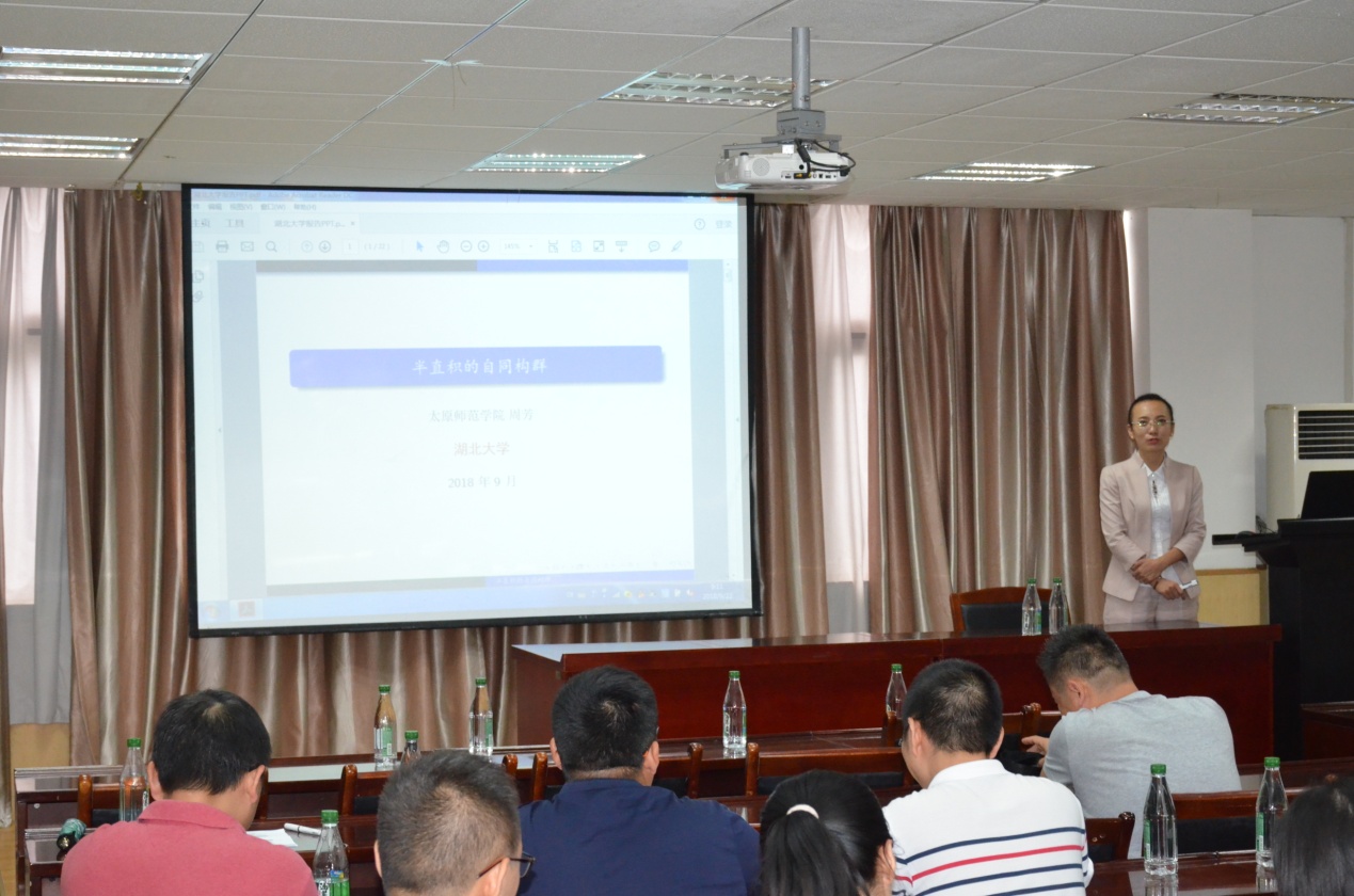 太原师范公司周芳副教授做了题为“半直积的自同构群”的报告。周教授由一些初等的结果出发,首先介绍了直积的自同构群的相关知识,然后对半直积的自同构群的结果做出介绍,包括:半直积的稳定自同构,半直积的自同构群的中心化分解,可裂亚循环p-群的自同构群,半直积的自同构群的正规化分解以及一类圈积的自同构群。