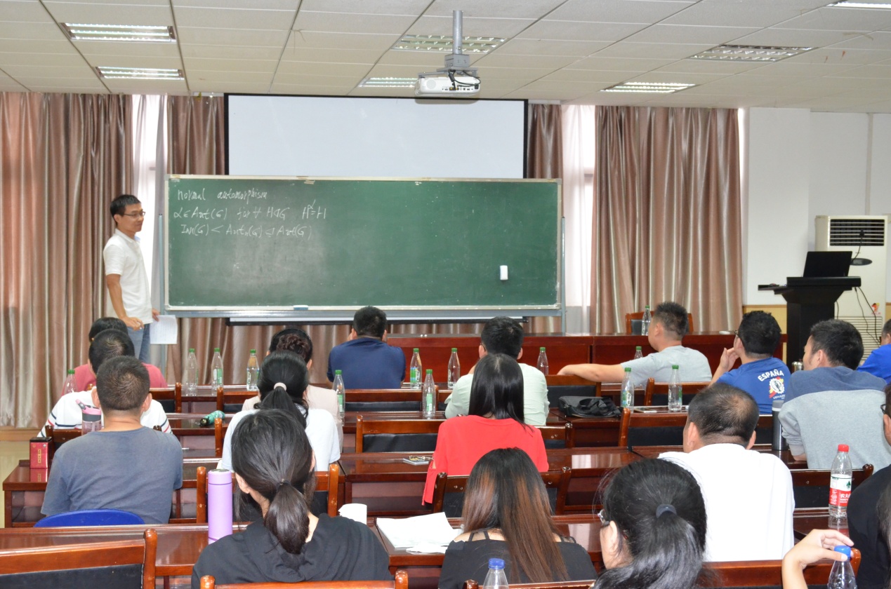 河北工程大学徐涛副教授做了题为“关于无限可解群的正规自同构”的报告。徐教授首先介绍了正规自同构的相关概念,然后针对几种类型的无限可解群,在已有理论的基础上给出了它们的正规自同构群的结构。