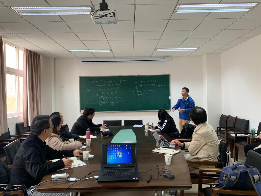 邱国寰教授的报告题目为“sigma-2方程的内估计”。报告中,邱教授介绍了与sigma-2方程的内估计相关的一些问题,同学们听的津津有味,报告结束后,邱国寰教授与在场的师生对于报告的内容进行深入的讨论交流,开拓了自身眼界。