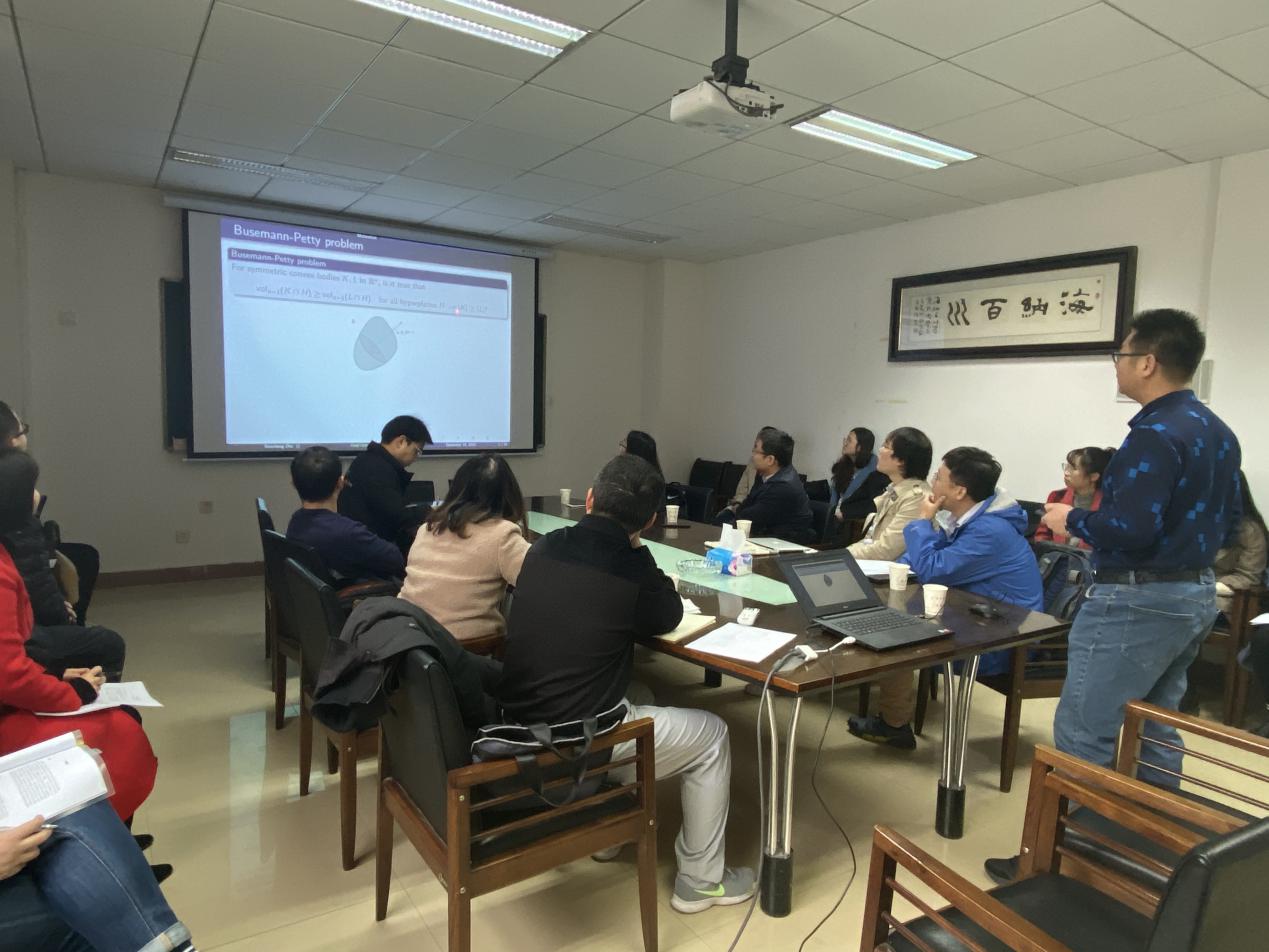 朱保成教授的报告题目为“Dual Orlicz-Brunn-Minkowski theory”。报告中,朱教授介绍了与Dual Orlicz-Brunn-Minkowski theory相关的一些问题,讨论新引入的双重Orlicz-Brunn-Minkowski理论, 特别是双重Orlicz-Minkowski和双重Orlicz-Brunn-Minkowski不等式,并围绕相关问题与参会师生进行讨论交流。