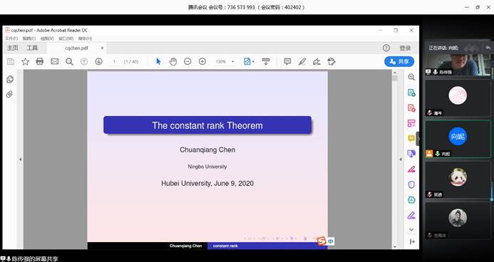 2020年6月9日上午,宁波大学陈传强教授应公司向妮教授邀请,为公司几何团队作线上学术报告,报告通过腾讯会议举行。会议由向妮教授主持,来自公司几何分析团队的教师、研究生10余人参与了报告。
