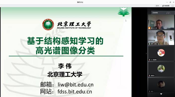 李伟教授报告的题目为《基于结构感知学习的高光谱图像分类》,这次报告以表示分类模型和回归分类模型为例,探讨了在复杂样本分布情况下的如何设计更优的分类器。