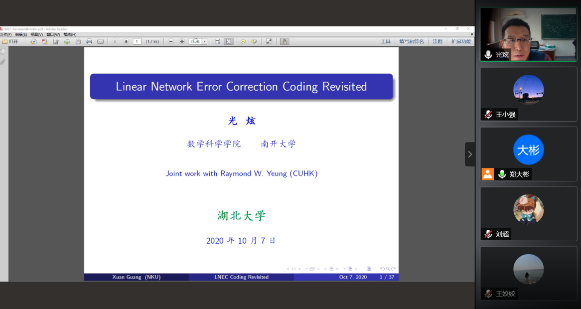 光炫副教授的报告题目为《Linear Network Error Correction Coding Revisited》,本次报告回顾了关于线性网络编码的一些基本结果,将网络纠错码与经典码的参数进行了比较,证明了现有的两个著名的网络编码纠错方法是等价的,介绍了如何运用图论中的一些结果,构造出size较小的MDS线性网络纠错码,使得网络纠错码可以在实际中被运用,解决了网络编码中一个著名的公开问题。