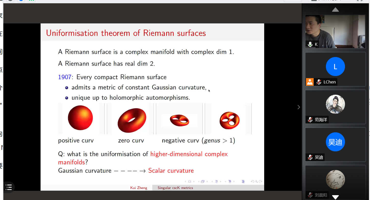 郑恺教授报告的题目为《Some estimates on extremal metrics》,在这次报告中我们将介绍一个关于极值度量的紧致性定理,我们这次报告主要的目标是找到流形的特殊曲率度量,这次报告分为三部分,第一部分简短的回顾了一下复几何和Kahler流形,第二部分介绍了Calabi问题关于具有常数量曲率的Kahler度量的存在性,最后一部分讲解了一下圆锥连续性方法和Kahler圆锥度量。