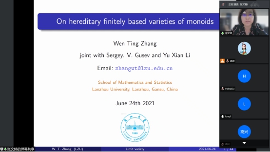 张文婷副教授做了题为“On hereditary finitely based varieties of monoids”的报告,首先介绍了Jackson, Zhang、Luo, Gusev以及Sapir关于半群的例子。然后给出了一类新的半群的极限簇,并证明了它们只是满足