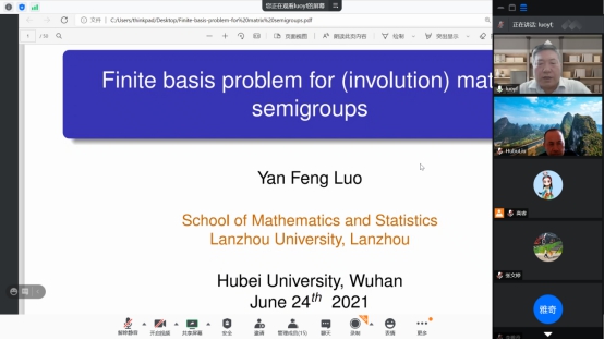 罗彦锋教授做了题为“The finite basis problems for matrix semigroups and its involution”的报告,首先指出研究有限基问题等价于研究某些代数是有限基的,这是Universal Algebra中最重要的研究问题之一。然后介绍了矩阵半群的有限基问题及研究进展。最后给出了相关的主要成果。