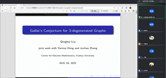 刘清海老师的报告题目是《Gallai’s conjecture for 3-degenerated graphs》,刘清海老师首先向大家介绍了报告相关的概念,接着就向大家报告了他们团队对于3-退化图的Gallai猜想的研究成果。