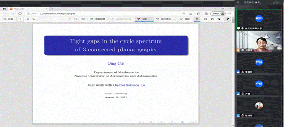 崔庆老师的报告题目是《Tight gaps in the cycle spectrum of 3-connected planar graphs》,崔庆老师首先向大家介绍了报告相关的概念以及研究背景,接着就向大家报告了他们团队对于三连通平图的圈谱的紧的gap的研究成果。
