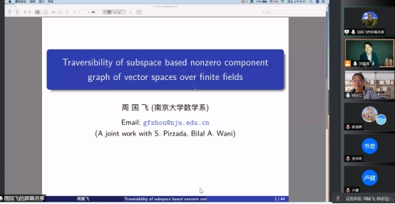 周国飞老师的报告题目是《Traversibility of subspace based nonzero component graph of vector finite fields》, 周国飞老师首先向大家介绍了报告相关的概念以及研究背景,接着就向大家报告了他们团队在有限域的向量空间中构造了一类图以及这类图的相关性质的研究成果。