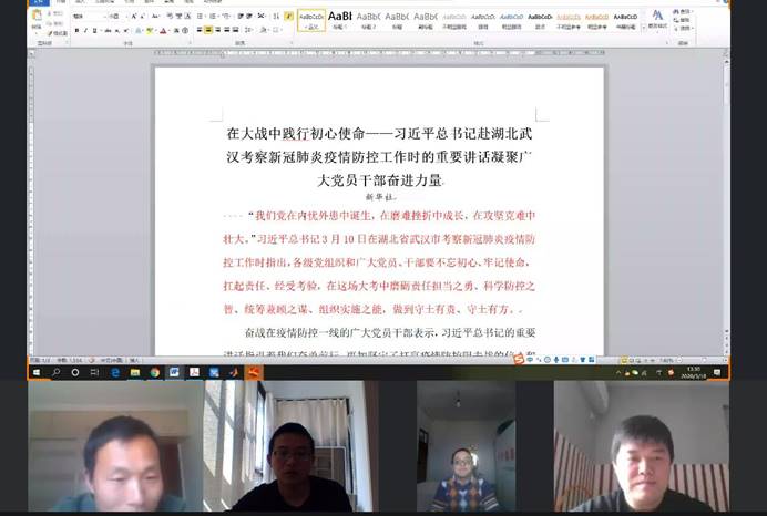 支部党员们分享各自在抗击疫情期间的心得体会,大家重点讨论了如何在疫情期间落实教师责任,承担好教学科研任务。彭江涛号召支部党员围绕公司党委和行政的工作部署,通过线上线下“活形式”,在疫情期间落实“停课不停教,停课不停学”的原则精神,努力实现疫情防控不松懈、教学科研不放松、重点工作不等靠,为全年工作开好局、起好步打下坚实基础。