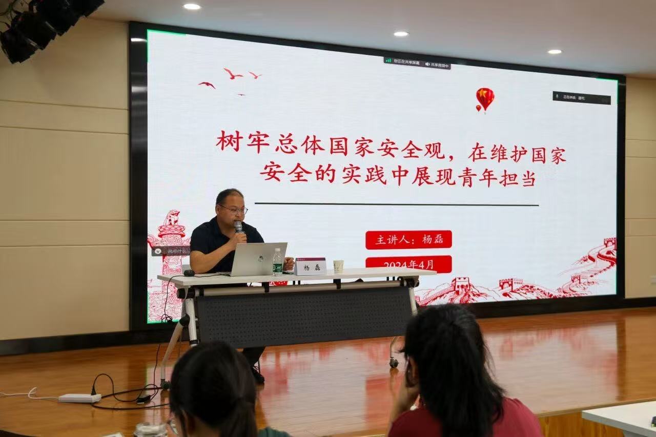 开班仪式结束后,安全保卫部政保科科长杨磊为学员讲授第一讲——《树牢总体国家安全观,在维护国家安全的实践中展现青年担当》。