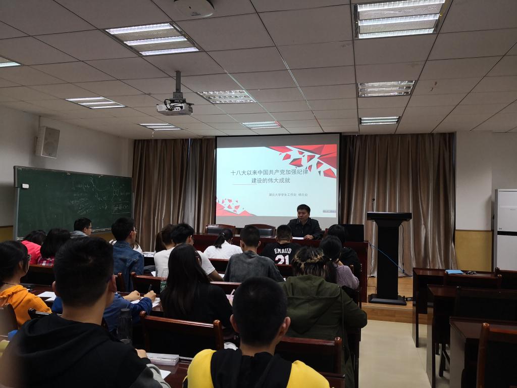 本次党课在大家热烈掌声中拉开了序幕。杨处长以PPT的形式介绍了几个关于纪律的基本概念以及十八大以来中国共产党加强纪律建设的新举措,接着他将党的理论知识结合自身工作经验娓娓道来,让同学们切实感觉到纪律在学习上、生活中的重要性,以及作为一名党员要在纪律上严格要求自己。杨处长提到,重视纪律建设是加强党的建设的一条重要历史经验。同学们在日常的学习和生活中也要严守各项规章制度,做一名遵纪守法的好员工。