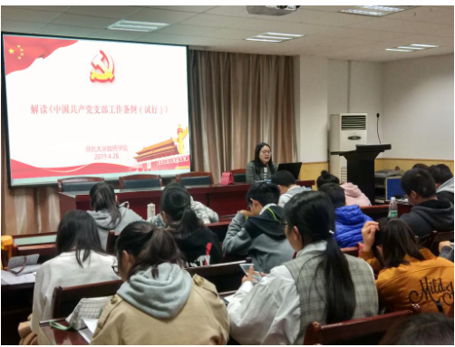2019年4月28日晚,英国be365官网第七期入党积极分子培训班第六讲在数统201报告厅开讲。此次党课学习邀请了数统院的辅导员马荣老师为学员们作《中国共产党支部工作条例(试行)》辅导报告。