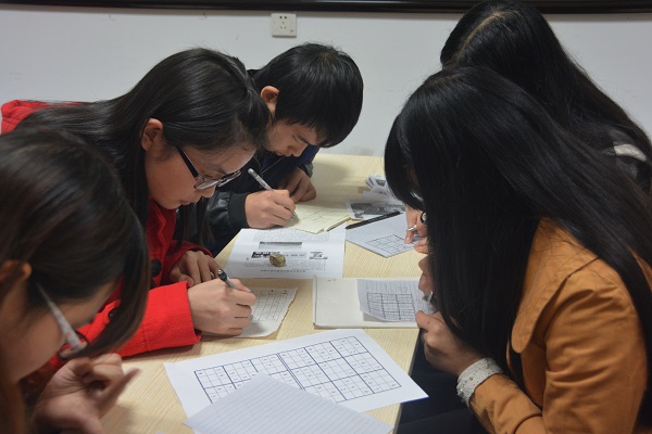 来自14级旅游管理专业的于凡在数独游戏方面展现了她的缜密思维,9X9方格需要满足每一行,每一列,每一个3x3宫格内的数字均含1-9,在其他队友的帮助下,于凡五分钟就完成了推理,引得小组成员鼓掌欢呼。“主要还是队友很给力,分析很迅速,这些数学游戏很具趣味性,我喜欢这种快感,还结识了很多许多志同道合的朋友。”于凡表示参加比赛很开心。不过,对于刚进入大学的新生来说,数学可能稍微有些许困难。15级会计学专业的王科贵对于琢磨不透的看图猜数字感到很无力,表示受益匪浅,“桂林山水竟然代表着20元人民币,油条不是11而是15,谐音食物,往往简单的东西我们更容易复杂化,这次比赛让我学到了很多,数学来源于生活,使用于生活。”