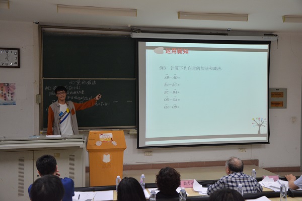 随着开场视频的倒计时完毕,主持人宣布本次讲课比赛正式开始。本次比赛分3分钟的即兴演讲和15分钟的模拟授课环节两部分。在模拟授课环节中,13级数学师范班的郭淇凯同学首先从代数与几何的交汇处出发,推出自己的课题《向量的减法》,又由相反数类比讲到相反向量,再从几何直观的角度把向量的减法的法则,意义与其几何意义相结合讲解出来。根据选手的表现,评委对他们的表现一一进行点评,其中裴老师也谈到了他对此次比赛的一些感受:“同学们都很棒,看得出来,同学们都对教师这个职业怀有极大的热情,特别是7号选手郭淇凯同学,无论是他讲课的出发点还是生成点,都很生动,尤其是他最后用图形来理解和推广,进而得出一般的规律,很能站在员工的角度去想问题。听这样的讲课很不错,你们让我很感动,希望同学们都会成为未来了不起的园丁!”