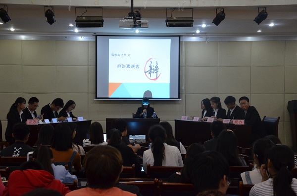 辩论赛分为开篇立论、辩驳立论、自由辩论和总结陈词四个环节。主持人陈玉晶宣布辩论赛正式开始,正方一辩喻程便抛出“男人比女人更需要关怀”的论点,继而充实立论,把握开场优势。反方一辩陈晓烨也非凡辈,她对正方的破绽展开攻击,积极阐明自己的立场“女人比男人更需要关怀”。辩驳环节,正方二辩吕杰锴和三辩曹俊杰环环相扣、步步紧逼,向反方展开连环攻击,反方二辩刘晓映和三辩陈辉处惊不变,始终面带微笑,沉着应对。自由辩论备受瞩目,双方辩手神态自若,场上局势确是剑拔弩张,正方辩友纷纷从法律的角度寻求论据引证自己的观点,反方辩友也着眼于法律,给予很好的回击。总结陈词,双方四辩各据一方,据理以争,努力把握最后的时机。