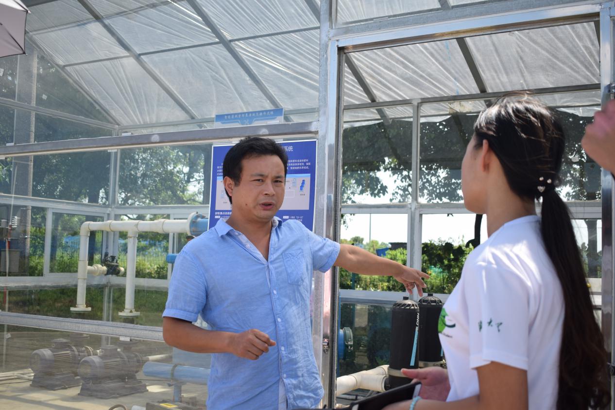 图为智慧恬园负责人伍经理给队员讲解自己农园使用的设备和技术。