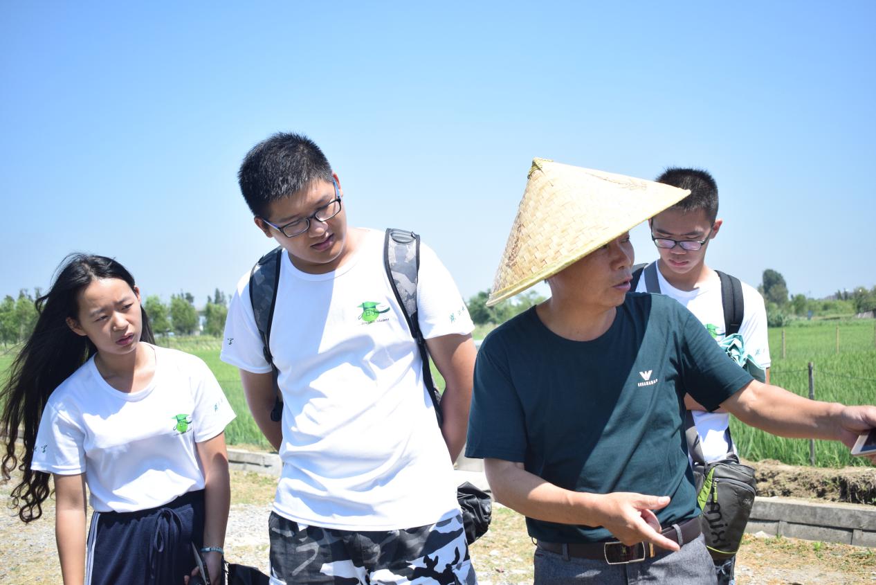 图为莲花荡负责人范书记在水稻田边给队员讲解水稻种植过程。