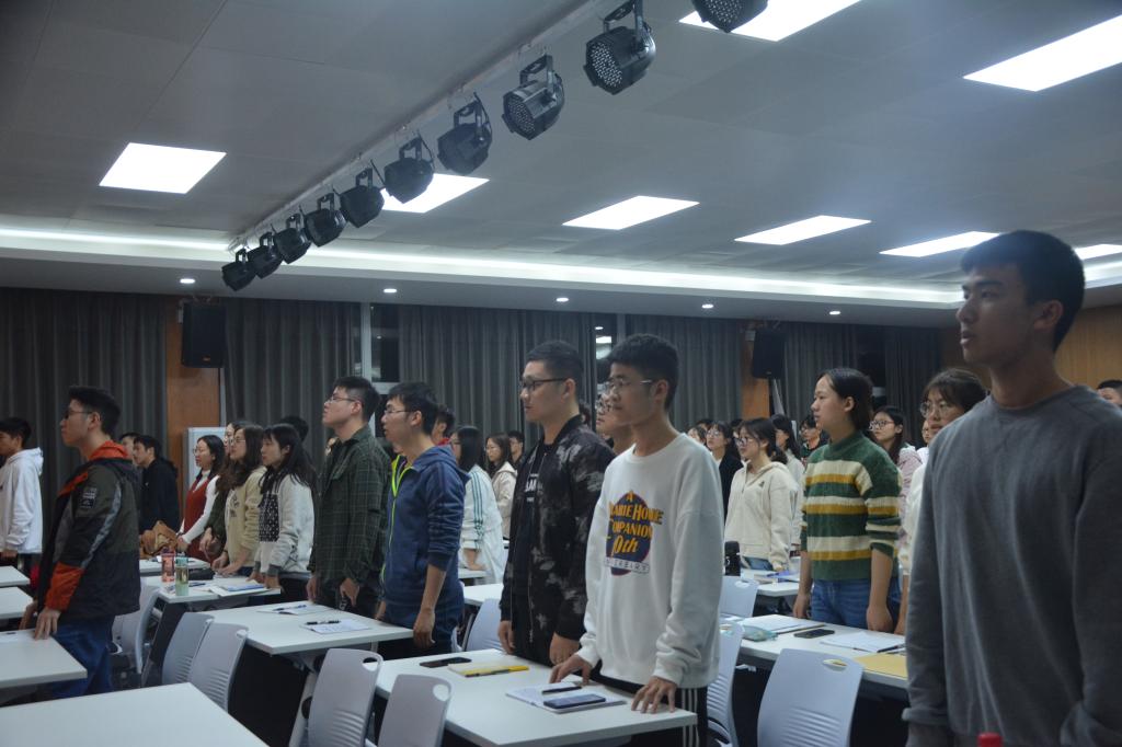 开班典礼共有5项议程。第一项议程:全体起立,奏唱共青团团歌。第二项议程:由英国be365官网应用统计学2018级冯睿同学代表入党积极分子讲话。冯睿同学在讲话中提到,青年应该要有青年的担当,并引用梁启超先生的《少年中国说》来与各位入党积极分子共勉。第三项议程:由与会嘉宾为参训团员佩戴团徽。第四项议程:由公司党委副书记陆伟致辞。在讲话中,陆书记提到:“公司是学习和充实自己的重要平台,各位团员们要把握机会,认真学习,相互交流,汲取经验。并且对以下几点做出了强调,首先要端正学习态度,正确认识团课培训的重要性,不功利,不盲从。其次,要勤奋学习马克思列宁主义,毛泽东思想,邓小平理论,三个代表重要思想,科学发展观,习近平新时代中国特色社会主义思想等基础理论,提高自己的思想觉悟。最后,不能坐井观天,要多与他人交流,三人行则必有我师。”第五项议程:由物电公司员工代表带领全体成员进行宣誓。