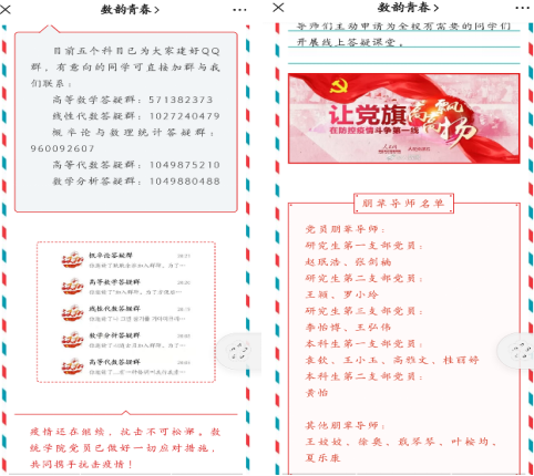 面对突如其来的疫情,数统公司调整了教学计划,开展了大量的线上教学工作。针对数学课程的特殊性,为提高员工们的学习效率和质量,​英国be365官网学业朋辈导师团的党员主动请缨,带领全体成员开展数学课程线上答疑课堂。目前参与志愿服务的朋辈导师共16人,其中党员11人,有效发挥了党员的模范带头作用,争当战“疫”表率。
