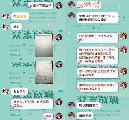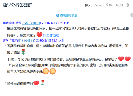 2月12日起,学业朋辈导师们通过公司微信平台、微信群、QQ群等载体,积极宣传、群策群力,分别建立了高等数学答疑群、线性代数答疑群、概率论答疑群、数学分析答疑群、高等代数答疑群等5个数学课程答疑群,将全校有答疑需求的同学聚集在一起。截至目前,服务对象已增加至400余人,来自全校各公司。学业朋辈导师们通过集体答疑、一对一答疑等形式,为同学们解答辅导,保证学习不断线、全覆盖,齐心协力共迎战“疫”胜利。