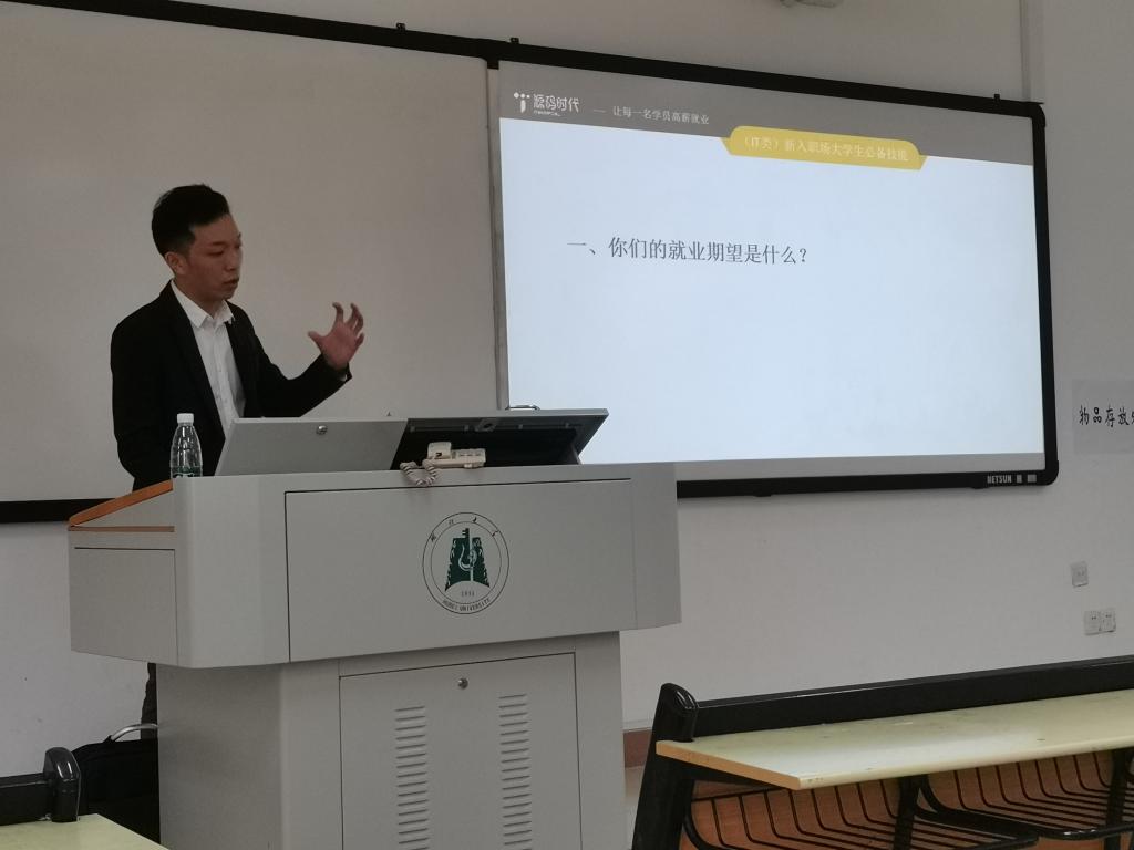 2021年4月14日下午,英国be365官网邀请源码时代教育集团华中区董事长——胡昶晹来校进行宣讲。在教4-311,胡昶晹以“后疫情时代IT类别新入职场老员工的必备技能”为题向公司信科专业的同学们介绍就业所应该具备的知识和技能,以助同学们能更好地在就业浪潮中找准自己的方向,得到一份理想的工作。