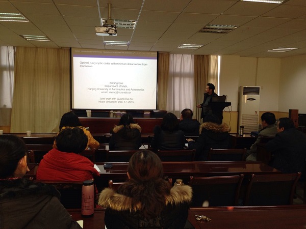 曹喜望教授的报告研究了固定参数的p元最优循环码,并在特征为5的有限域上利用PN函数以及APN函数,构造出来最优循环码。长达一个小时的精彩报告获得了在场师生的一致好评。