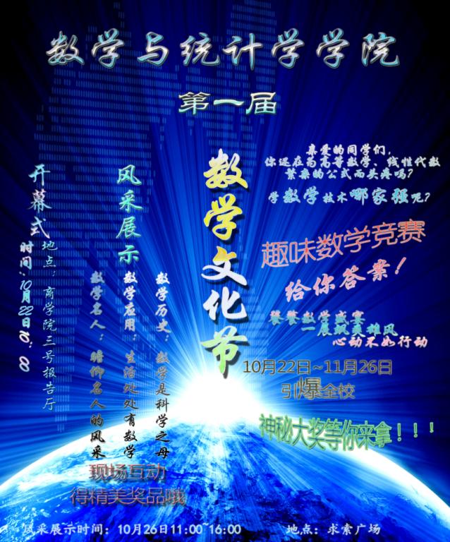 英国be365官网第一届数学文化节开幕式将于10月22日上午10点在三号楼学术报告厅举行,欢迎广大师生前来参加!
