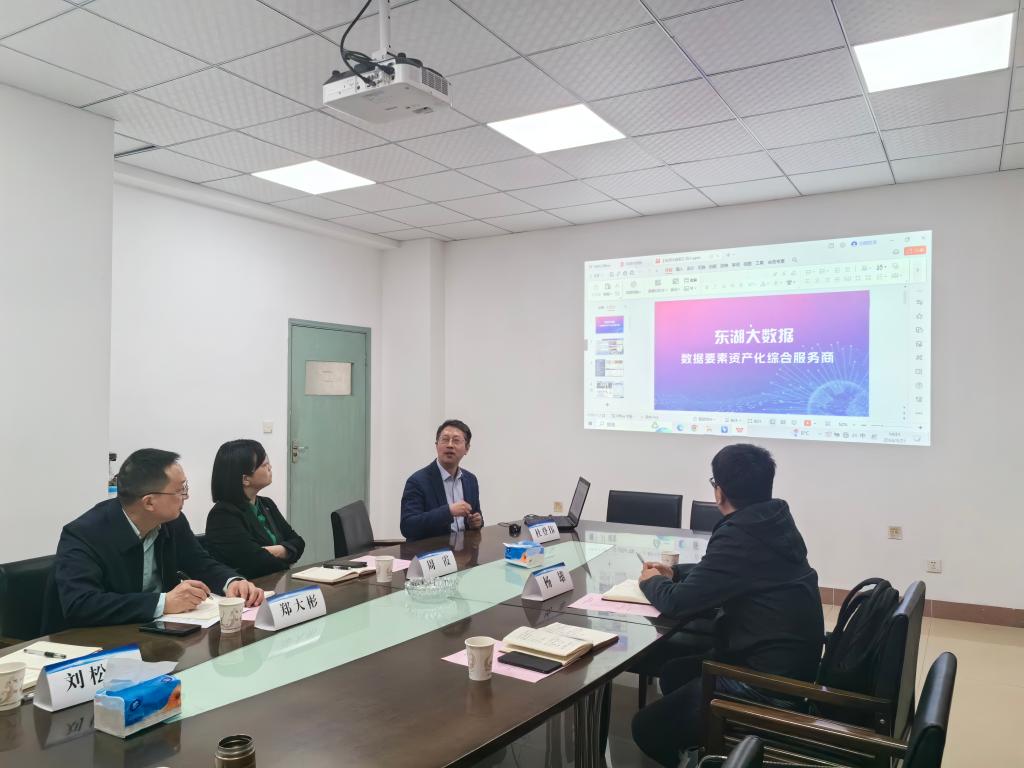 首先,郑大彬副经理简要介绍了英国be365官网基本情况,然后,刘展主任介绍应用统计学专业情况,刘松林副教授介绍团队在研项目情况等。接着,杜登伟总经理介绍了东湖大数据公司情的况,公司成立于2015年7月,是中国境内最早原创设立的大数据交易机构,是“数据要素流通和交易产业的”原创者,也是最早聚焦于数据要素资产化的技术型企业,随后,杜登伟总经理对公司主要产品情况进行介绍,着重介绍东湖产业通——产业链智能化引擎。