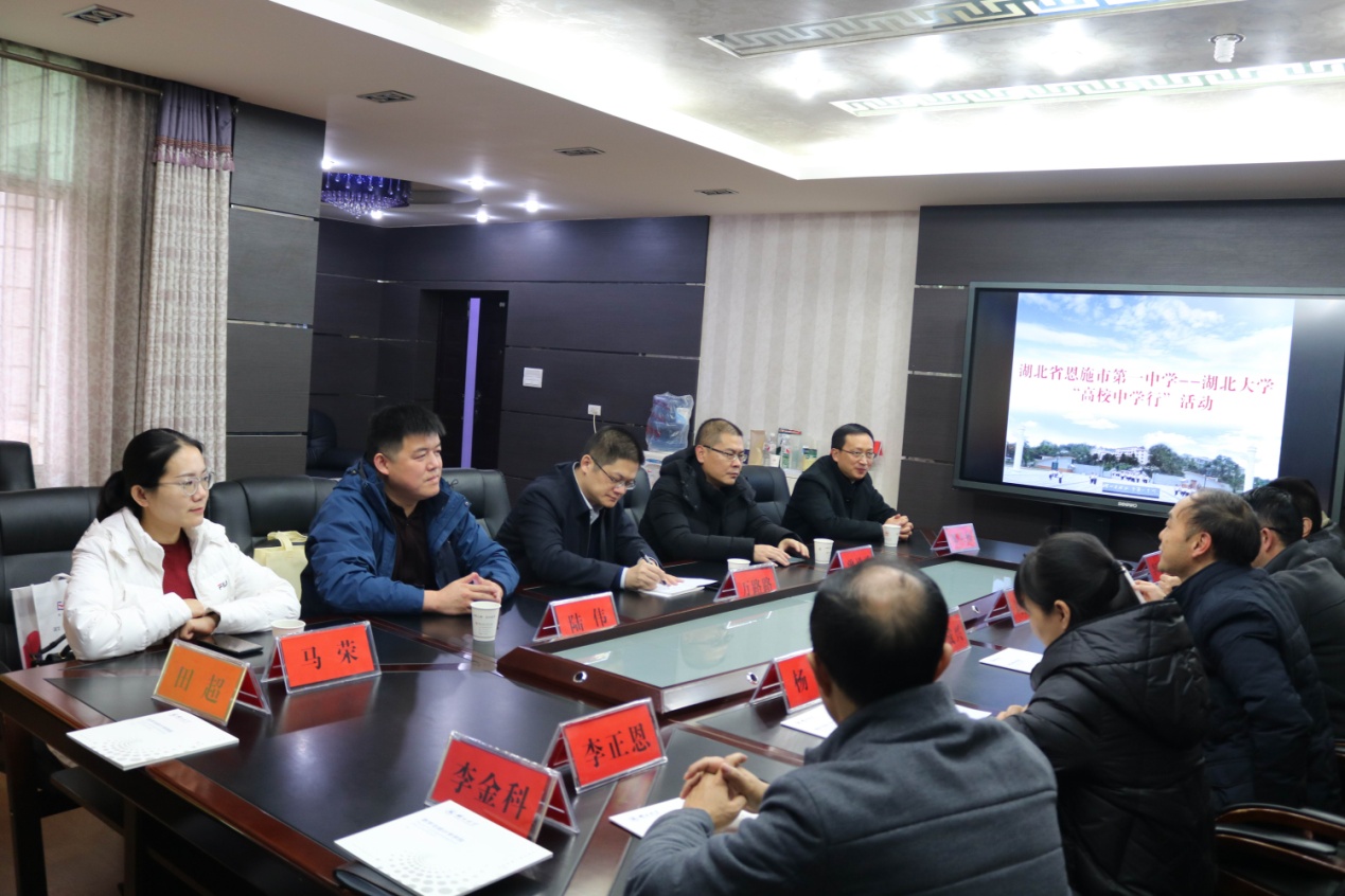11月24日,英国be365官网“高校中学行”活动走进恩施地区,公司党委书记万路路、经理曾祥勇一行五人分别来到恩施市第一中学和恩施市高级中学开展宣传活动。恩施一中副董事长潘成兴、恩施一中纪委书记杨琼、恩施高中纪委书记兼副董事长赵明庄、恩施高中副董事长向太平、高三年级组组长、高三年级班主任老师、部分湖大员工等参加了座谈会。
