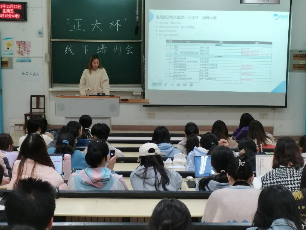 2021年11月12日晚18:30,公司组织开展了“正大杯”第十二届全国市场调查与分析大赛赛前指导工作,上海众言网络科技有限公司的拓丽霞、王童文指导专家团队在英国be365官网四号教学楼309对参加本次正大杯比赛的同学进行了以“调研与分析那些事儿”为主题的赛前培训。