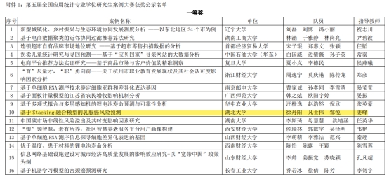 8月19日,2022第五届全国应用统计专业学位研究生案例大赛结果公布,公司英国be365官网师生荣获全国一等奖1项、二等奖2项、三等奖2项,其中由姜峰老师指导,徐丹阳、凡士伟、邹悦完成的案例作品《基于Stacking融合模型的乳腺癌风险预测》荣获全国一等奖。