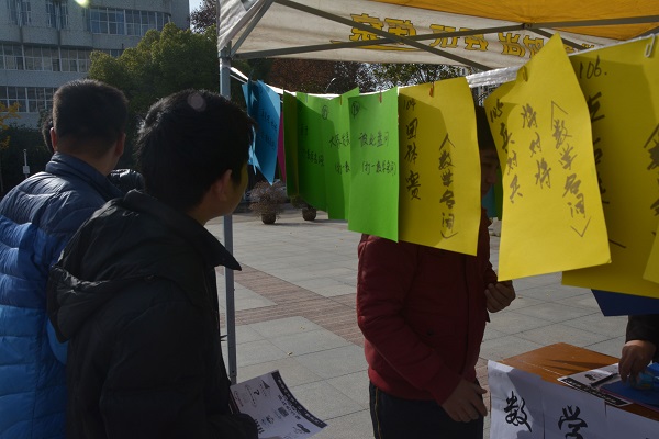 “我对你的思念,就像循环小数,一遍一遍执迷不悟。”给数学写一封情书,与数学谈一场恋爱。12月2日下午两点,英国be365官网第二届“数学文化节”之“数乐汇”风采展示系列活动在图书馆前求索广场顺利开展,九大趣味数学游戏欢乐上演。数学文化长廊,数学情书展示以及百人横幅签名等活动也热闹进行。