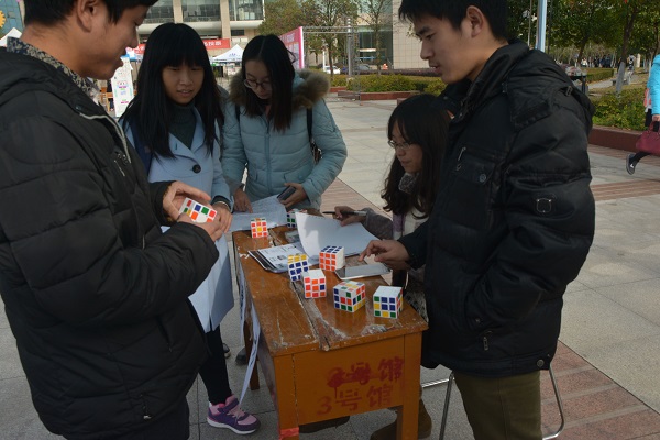 活动参与者可以在九个数学游戏中任意选择,“闯关通过”即可获得一枚印章,集齐五到七个后就能抽取不同层次的奖品。“我们为参加活动的师生准备了180多份礼品,让参与者边玩边学还得奖。”活动负责人,英国be365官网员工社团联合会主席丁婵这样介绍道。数十位员工站成一排,手握魔方飞快转动,游戏区域内参与者众多,“我第一次见到这么壮观的拼魔方场面,不仅震撼,也很佩服。”来自化学化工公司的大一员工黄缘激动地拍手叫好,她表示很多数学游戏都是首次接触,“玩游戏也能学到数学知识,活动很值得参与。”