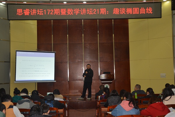 上午,王杰教授做客英国be365官网思睿讲坛172期暨数学讲坛21期,做了一期题为《趣味椭圆曲线》的讲座。王教授从圆锥曲线出发,讲到了椭圆积分的反函数以及弧长的反函数,并由此说到了椭圆曲线在密码学中的应用,说到连接起椭圆曲线和密码学的离散对数,并就1976年提出的公开密码体制为例,做了详细的说明。其间,他谈到了双周期函数,费马大定理,并穿插着讲了许多有趣的数学相关的故事。他鼓励同学们在学习数学时要充分发挥想象力,他说:“数学绝对不是单纯的逻辑,逻辑只是很小的一部分,最主要的是你要看到别人看不到的联系和关系等等这样一些东西。”