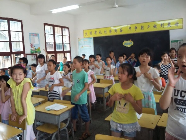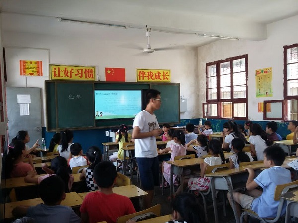 7月15日,志愿者们在支教地点杨芳小学隆重开展了此次“希望家园”的开班仪式。该培训班共接收了50个左右的员工,员工年龄覆盖7岁到14岁。经过周末两天的修整后,18日志愿者们正式开始上课了。