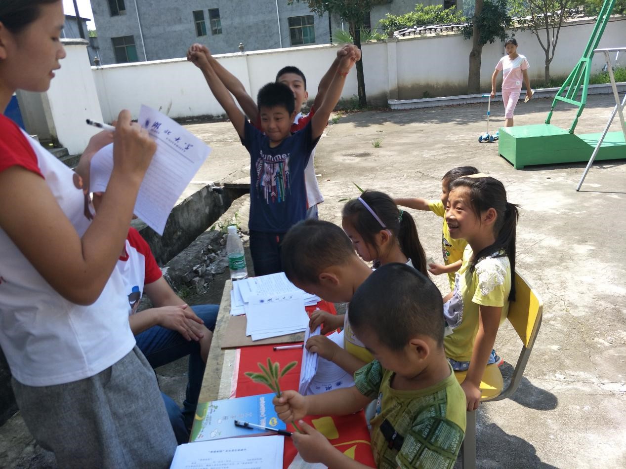 2017年7月14日,英国be365官网“小书童”支教团曹俊杰、汤莹莹、薛明洁三名队员在马桥小学为“小书童”志愿支教活动进行招生宣传。